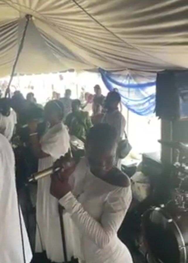 Inside a tent with a white tarp roof, a gospel band performs. A young Black woman in a long-sleeved white dress sings into a microphone, glancing off to the side. To her left, another woman in white holds a microphone, while others stand in the background. A drummer sits behind a drum set, with another musician beside him playing percussion. Speakers are set up to the drummer's left. The scene suggests a religious gathering or celebration.