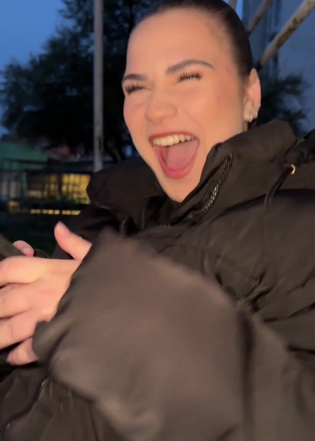A young woman with hair pulled back and wearing a black puffer jacket laughs uproariously with her mouth wide open