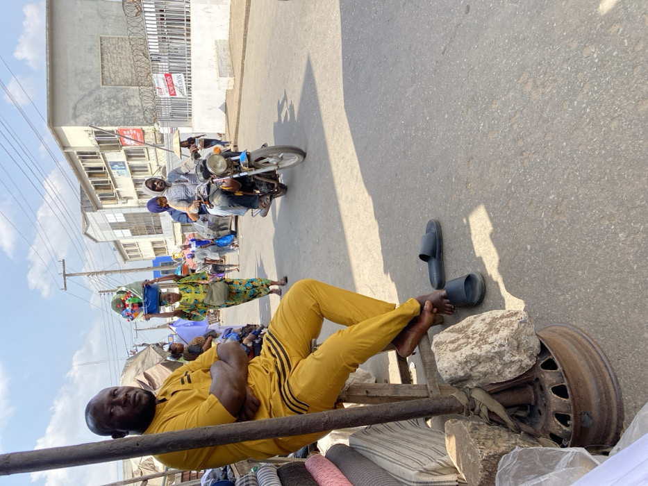 The image depicts a bustling street scene in a commercial area of Ibadan, Nigeria, under bright daylight with clear skies and distinct shadows. In the left foreground, a dark-skinned man with a short haircut is seated on a makeshift wooden stool, leaning against a vertical metal pole. He wears a mustard yellow traditional tunic and trousers featuring two black horizontal stripes on the chest and three black stripes near the trouser cuffs. His arms are crossed, and he gazes slightly leftward. His bare feet are visible, with a pair of black slide sandals resting on the asphalt beside him. Stacked textile rolls are visible to his left, behind the pole, which is anchored by a rusty metal wheel rim weighted with large rocks. The midground features an asphalt road. A woman walks from right to left, balancing a blue basin filled with various colorful plastic bottles on her head, her arms slightly raised for support. She wears a patterned green and yellow dress and carries a light-colored shoulder bag. Behind her, other pedestrians are visible further down the street. To her right, a light-blue motorcycle, carrying two individuals, moves toward the background. The driver wears a light-colored hooded top and sunglasses, while the passenger behind them wears a blue head covering. The background reveals multi-story concrete buildings. On the right, a faded building with multiple windows is visible. Further along, a white wall topped with black spiked fencing displays a red banner stating "NOW OPEN." Overhead, numerous utility poles support an array of power lines that crisscross the sky, which is predominantly clear with scattered white clouds.