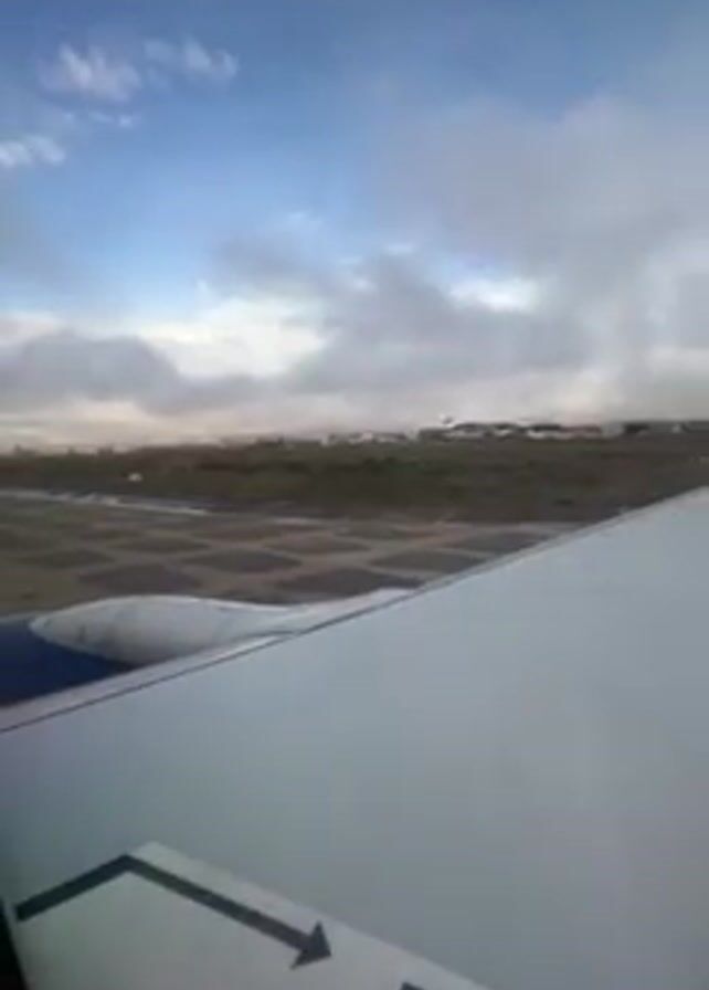view from an airplane window, looking out over the plane's wing and towards a runway