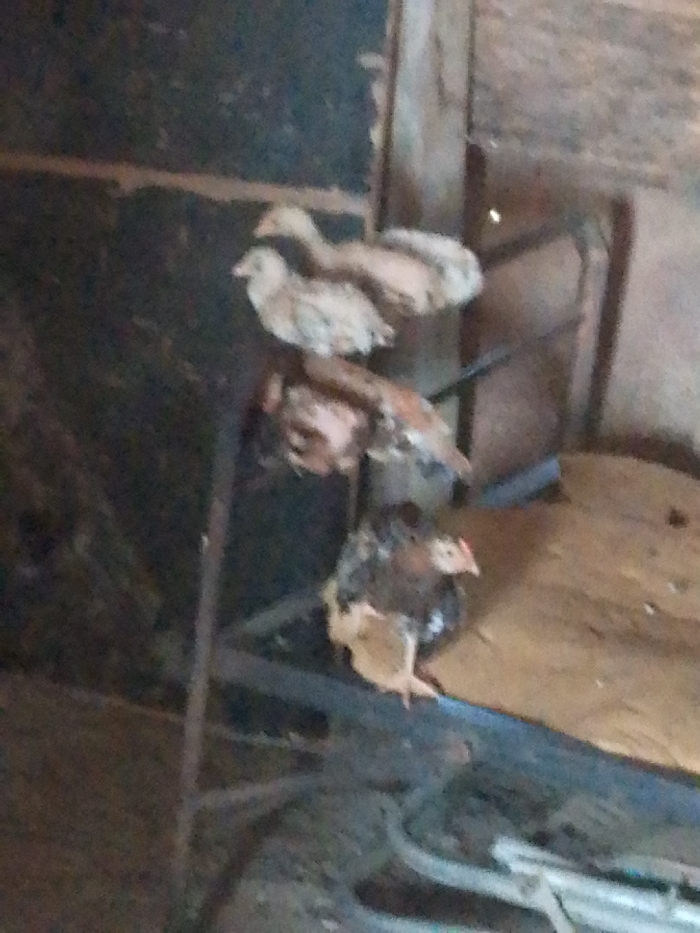 Four chickens are visible in a cluttered, dimly lit space. Three chickens are perched on a shelf or ledge, appearing mostly white and blurry. One chicken, closest to the foreground, displays brown and white plumage. The setting has a rustic feel, possibly a barn or coop interior, with visible wood and metal structures. The overall image is somewhat grainy.