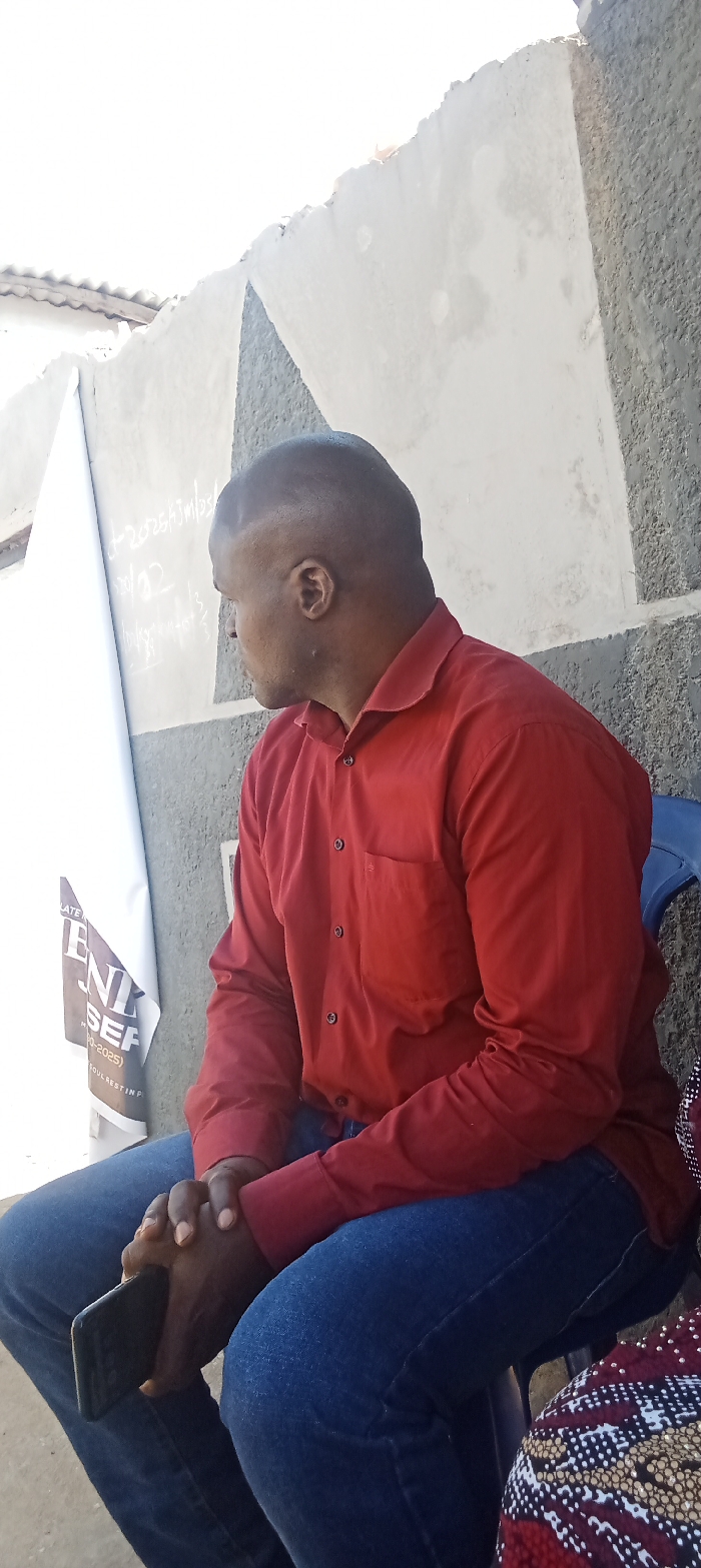 A dark-skinned adult male with a short fade haircut is seated outdoors in Narayi, Nigeria, looking left