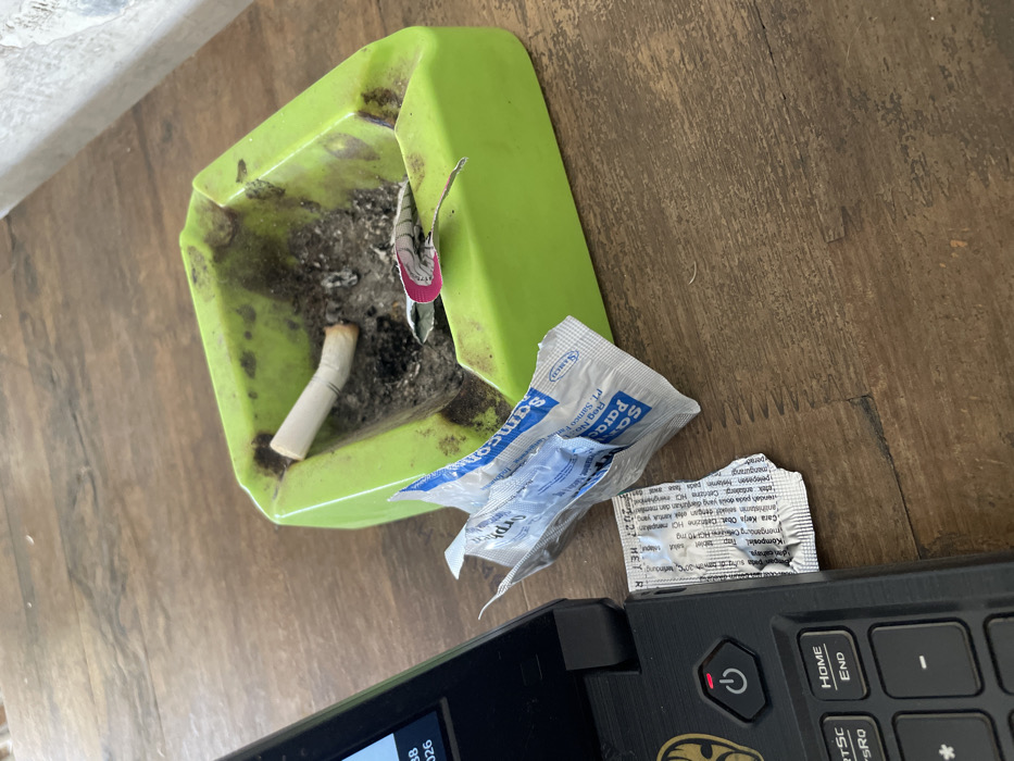 The scene, set in Sukajadi, Indonesia, displays a collection of items on a light brown wooden table surface. On the left, a portion of a black laptop is visible, showing a red illuminated power button, "Esc", "Home", and "End" keys, and a yellow emblem on the palm rest. The laptop screen partially displays numeric data "38" and "026". Adjacent to the laptop are two pieces of used medical packaging: a silver foil blister pack, torn open and displaying "Cetirizine HCl 10 mg" and an expiry indication of "2027 NET R" in Indonesian text; and a crumpled blue and white sachet labeled with "Samcom" and "Paracetamol" in Indonesian. To the right, a heavily used, bright lime green, square plastic ashtray contains a substantial quantity of dark gray cigarette ash, multiple cigarette butts, and debris. A single light-colored cigarette butt with a filter is prominently resting on the ashtray's rim, partially within the ash. The interior of the ashtray exhibits dark stains from extensive use.