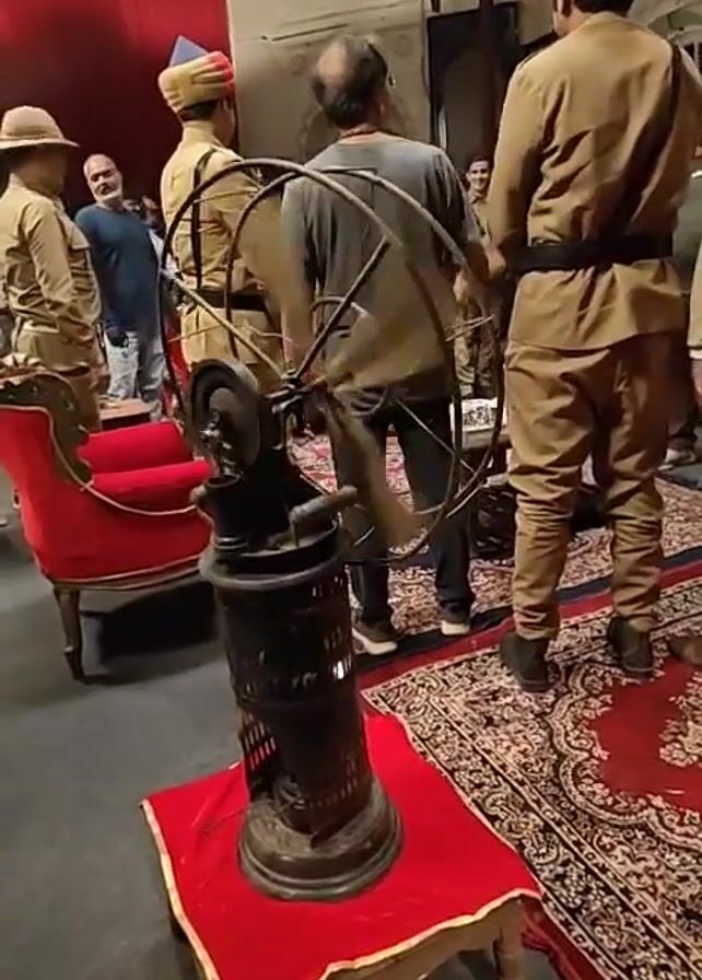 vintage fan operating on a small table, adorned with a red cloth. The fan is dark in color, with a wheel-like structure at the top and a cylindrical base that has a visible flame burning inside. Several people are in the background, some wearing what appears to be uniform-like clothing, one in a hat. The room seems to be staged with older furniture, including a red-upholstered chair, and a patterned red rug on the floor. A few other people can be seen standing around, observing the scene.