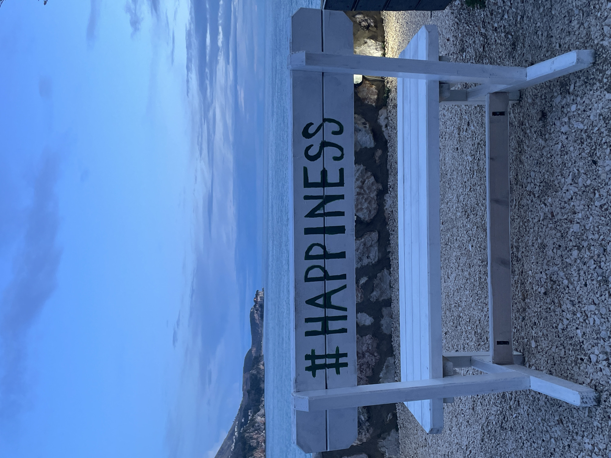 A white wooden park bench, centrally positioned, faces southeast over the Adriatic Sea at Kamenovo, Montenegro. The backrest of the bench displays the word "#HAPPINESS" in dark green capital letters. The ground surrounding the bench is covered in light-colored gravel. Immediately behind the bench, a low retaining wall of irregular light-colored stones runs horizontally. The sea beyond is calm and extends to a distant mountainous coastline on the left, dotted with structures. To the right, a prominent headland or small island (Sveti Stefan), featuring numerous buildings, juts into the water. The sky above is a gradient of blue, darkening towards the top, with scattered grey clouds, indicative of either dawn or dusk. No people or active subjects are present.