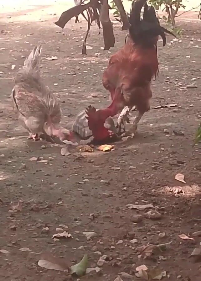 The scene is set outdoors with a hen, a rooster, and a turtle in view. The ground is covered in dirt, leaves, and small rocks. The hen is on the left side of the frame, standing on the ground. To the right of the hen, the turtle is positioned in the center, seemingly eating something. The rooster is standing to the right of the turtle, its head bent down to the ground. In the background, there are some withered branches and a green bush. The video appears to be taken on a bright day, with the sunlight casting shadows on the ground.