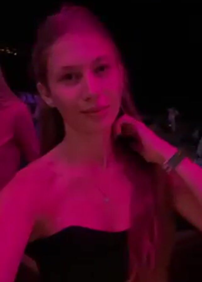 A young woman is filming a video of herself dancing. She is wearing a black strapless top and has long brown hair. There is a green bracelet on her right wrist and a necklace around her neck. The background is dark, with a few people visible. The lighting changes, showing the woman in red, purple, and green light. The music is loud and sounds like a party.