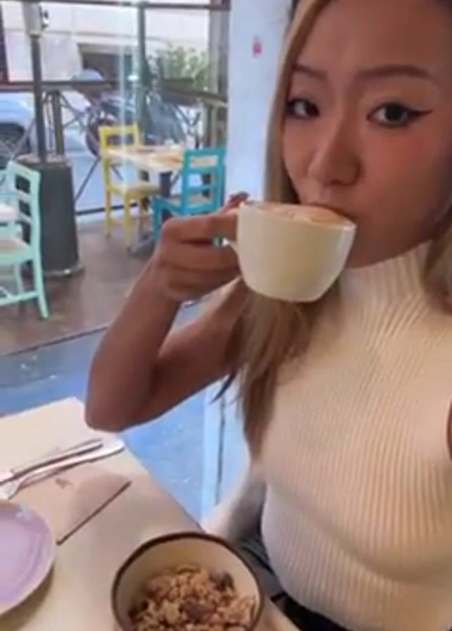 A woman is sitting at a table in a cafe, drinking from a white cup. She has long blonde hair and is wearing a white top. In front of her on the table are a plate of cereal, a container of yogurt, and a slice of cake on a wooden board. There are also plates, utensils, and a bottle of water on the table. The cafe has colorful chairs and tables, and a view of the street outside. The woman takes a sip from her cup.