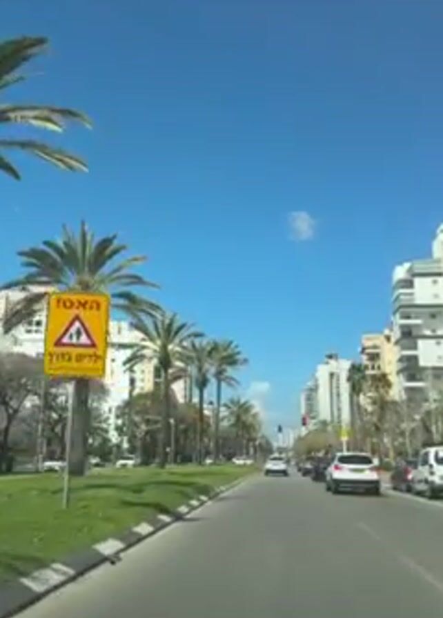 street view taken from inside a moving vehicle. On either side of the road are palm trees and green grassy areas. Tall buildings line both sides of the street. Cars are driving on the road in both directions. The sky is blue with a few small clouds. In the median of the road, there is a yellow sign with black symbols. A person is walking on the left side of the road. The traffic light is green.