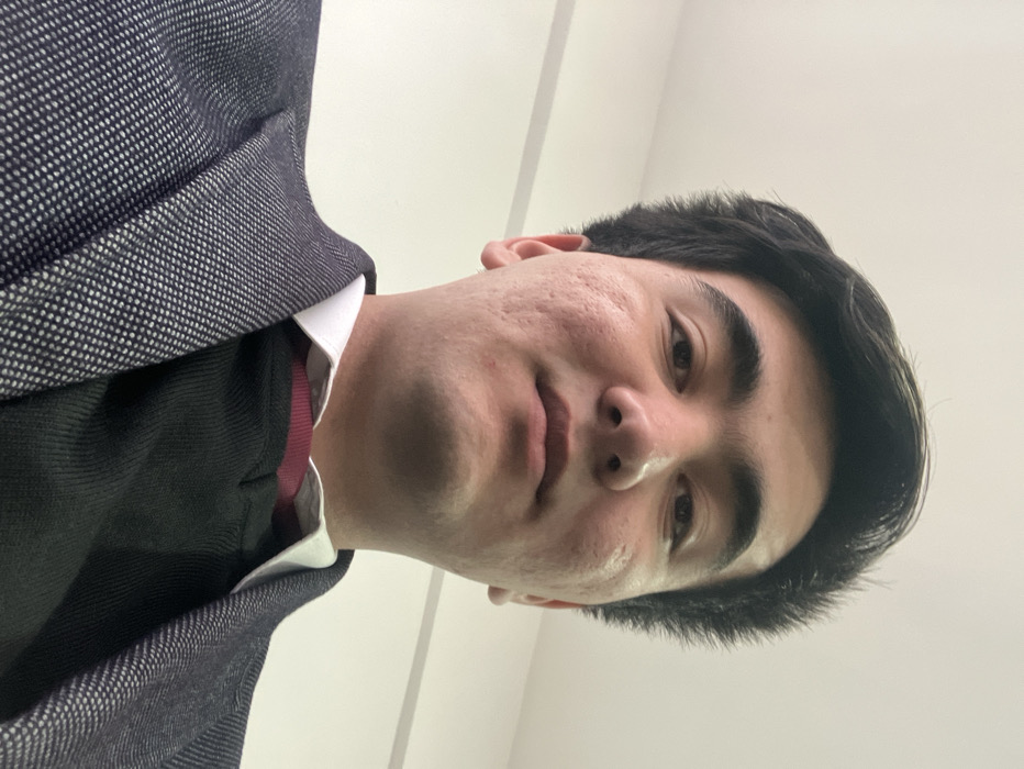 The image presents a close-up, low-angle portrait of a male individual. He has dark hair and facial skin displaying acne scarring on the cheeks. He maintains direct eye contact with the camera. His attire includes a white collared shirt, a dark red band visible beneath the collar, a black ribbed long-sleeved sweater, and a dark grey blazer with a textured, small-patterned weave. The background is a plain, light-colored interior surface, consistent with a wall or ceiling. The scene is indoors. No specific visual information within the image identifies its precise location within Namangan City, Uzbekistan.