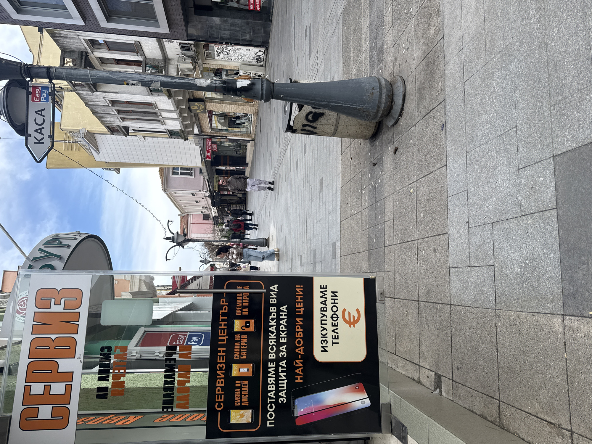 The image depicts a ground-level view of a pedestrian shopping street in Burgas, Bulgaria, characterized by tiled pavement and buildings lining both sides. In the immediate foreground, to the left, a black and orange advertising sign for a "СЕРВИЗЕН ЦЕНТЪР" (Service Center) is prominently displayed. The sign details services such as "СМЯНА НА ДИСПЛЕЙ" (Display Replacement), "СМЯНА НА БАТЕРИЯ" (Battery Replacement), "ПРЕМАХВАНЕ НА ПАРОЛА" (Password Removal), and "ПОСТАВЯМЕ ВСЯКАКЪВ ВИД ЗАЩИТА ЗА ЕКРАНА" (We provide all types of screen protection) at "НАЙ-ДОБРИ ЦЕНИ!" (Best prices!). Below these, it states "ИЗКУПУВАМЕ ТЕЛЕФОНИ" (We buy phones), accompanied by a euro symbol. The sign features graphics of smartphones, including an iPhone with a cracked screen and others with screen protectors. The reflection on the glass facade behind the sign shows large orange letters spelling "СЕРВИЗ" and the word "БУРГАС" faintly. To the right of the foreground, a dark grey, conical streetlamp base with a fluted design stands next to a cylindrical concrete waste bin. The bin has black graffiti, specifically a tag resembling "16" or similar, spray-painted on its side. The pavement in this area is composed of light grey and darker grey square tiles and exhibits scattered small white and dark debris. The midground features a pedestrian street extending into the distance, populated by several individuals. A woman in a plaid shirt and light-colored jeans is seen walking towards the right, glancing left. A man in a brown jacket, light trousers, and sunglasses walks directly towards the camera. Other pedestrians are visible further down the street. Buildings with varied architectural styles, some featuring balconies and ground-level shops, line both sides of the street. A sign for "КНИЖАРНИЦА ХЕРМЕС" (Hermes Bookstore) is discernible on the left side of the street. Attached to the foreground streetlamp is a white directional sign pointing right, reading "КАСА Easy Pay" (Cashier Easy Pay). Overhead, string lights are strung across the street between buildings. The background shows the pedestrian street continuing, with additional buildings and a few distant figures, under a sky that appears partly cloudy.
