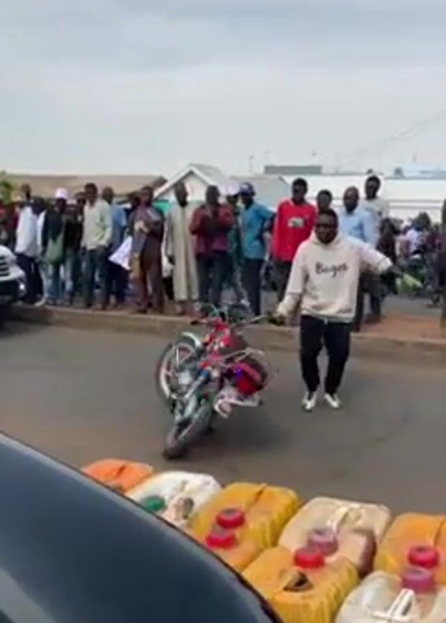 group of people standing along the edge of a street, looking towards the center of the road. A decorated motorcycle lies on its side. A man wearing a white sweatshirt and black pants dances around the motorcycle. Behind the camera's vantage point, there is a black vehicle with numerous yellow jerrycans strapped to a small cart. The jerrycans have red caps. Another man in a green shirt with a white floral pattern stands near the motorcycle. The sky is overcast.