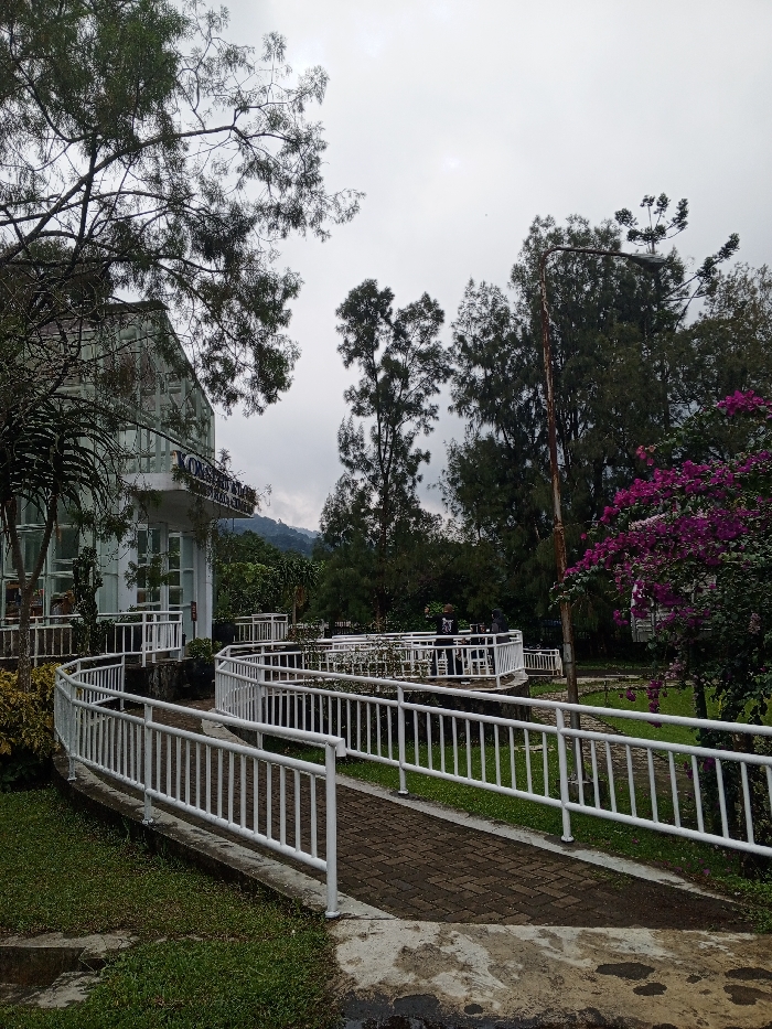 A building with glass walls, likely a cafe or restaurant, stands behind a white railing. A curved brick path with railings leads towards the building. Tall trees and lush green foliage surround the area. Purple flowers add a pop of color to the scene. The sky is overcast, creating a muted, peaceful atmosphere. A mountain range is faintly visible in the distance.