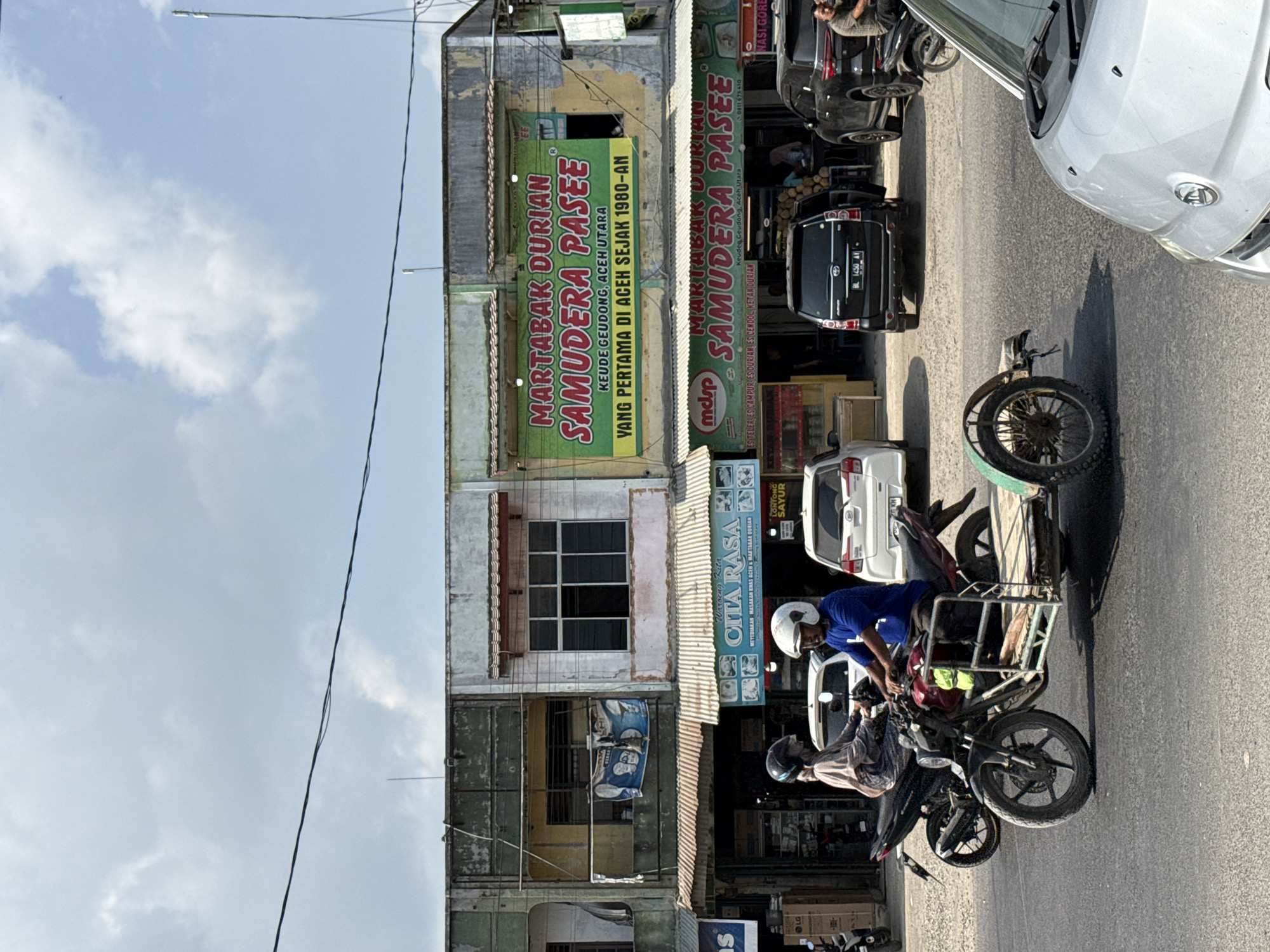 The image displays a daylight street scene in Keudegeudong, Aceh Utara, Indonesia. An asphalt road occupies the foreground and midground, on which a red motorcycle with an attached sidecar is prominently featured, driven by an individual wearing a blue shirt and a white full-face helmet. Behind this motorized tricycle, a black motorcycle is ridden by a person wearing a dark full-face helmet and a light-colored, patterned long-sleeved garment. The front portion of a silver vehicle is partially visible on the extreme right foreground. Along the right side of the street, several vehicles are parked at an angle. These include a black MPV with an open rear passenger door, bearing license plate "BL 1450 AV," a white compact SUV, and a black SUV. A male individual in a short-sleeved patterned shirt is observable in the driver's seat of the black SUV. The background consists of a row of two-story or three-story commercial buildings/shophouses. The central building features a large green banner displaying "MARTABAK DURIAN SAMUDERA PASEE KEUDE GEUDONG, ACEH UTARA YANG PERTAMA DI ACEH SEJAK 1980-AN." Below this, a blue corrugated awning covers a sign for "Warung Kita CITRA RASA," which advertises Acehnese specialties and Durian Martabak, along with a smaller blue sign identifying "MARTABAK DURIAN SAMUDERA PASEE." The adjacent buildings to the left exhibit weathered facades in varying shades of grey, yellow, and white. A blue and white banner is draped over a balcony railing on the leftmost structure. The sky overhead is partly cloudy with patches of blue. Multiple black overhead wires are visible against the sky, traversing the upper section of the frame.