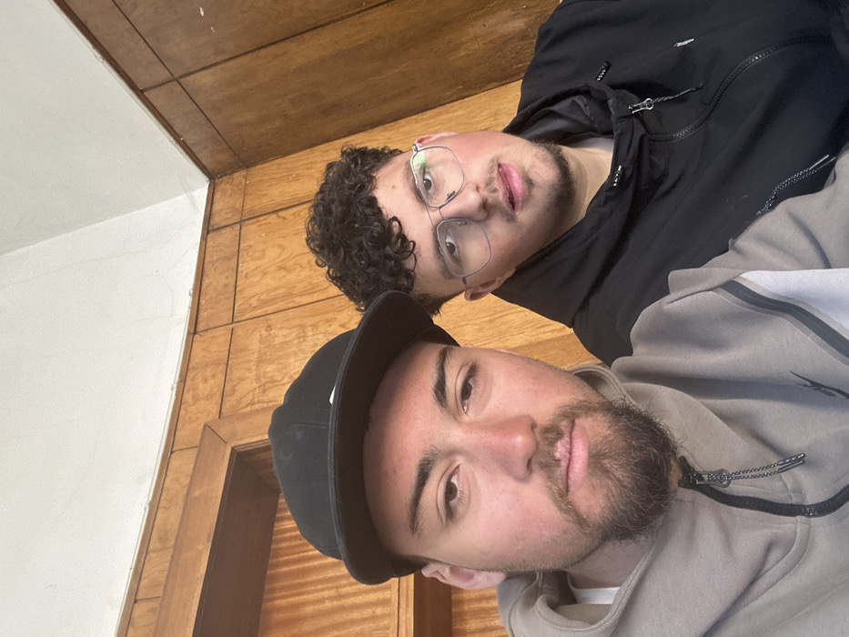Two adult males are depicted indoors in Dupnitsa, Bulgaria. The male on the left, foregrounded, wears a black baseball cap and a light brown/tan zippered hooded jacket. He has a beard and mustache and looks directly at the camera. The male on the right wears eyeglasses with thin frames and a black zippered hooded jacket. He has dark, curly hair and stubble, also looking towards the camera. Both individuals are positioned side-by-side. The background consists of a lower section paneled with light-colored wood, featuring vertical and horizontal seams, and an upper section of a white wall.