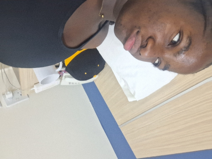 A single individual with dark skin is depicted lying supine on a bed, their head resting on a white pillow. The individual is wearing a dark, sleeveless top and a delicate gold-toned necklace. Their gaze is directed upwards and to the left, with lips slightly pursed. The background features a light wood-paneled headboard with a blue accent strip above it. To the individual's right, on a bedside surface, a black and yellow baseball cap, a white ceramic mug, a white corded telephone, and a white tube dispenser are present. An electrical wall outlet with a white plug and attached wires is visible on the adjacent wall. The scene is an indoor setting, likely a bedroom or hotel room, located in Close, Nigeria.