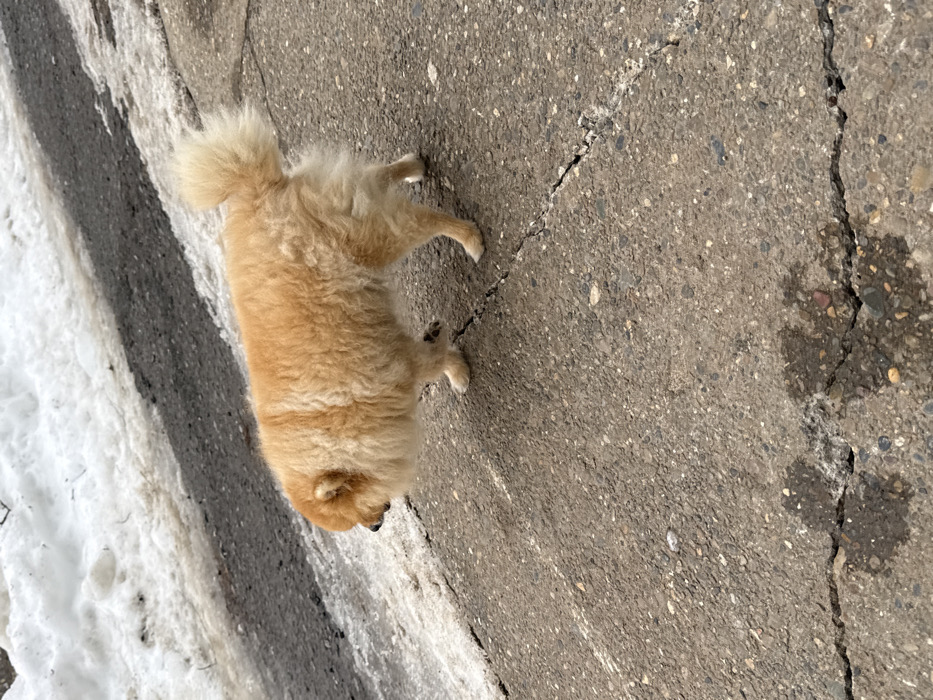 - "small, fluffy dog with light orange-tan fur standing on a cracked grey paved surface in Chaikovsky, Russia" by FM-PNepy2, licensed under CC BY 4.0