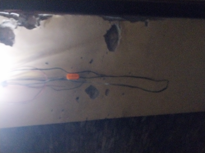 The image depicts an indoor scene in the city of Khan Yunis, Palestinian Territory. A single, intensely bright light source, likely a bare bulb, is positioned at the top center, casting strong light rays downwards onto a light-colored wall. Multiple dark electrical wires hang from the area of the light source, one of which has an orange cylindrical connector attached approximately one-third of the way down from the top of the frame. The wall exhibits several irregular dark patches and areas of apparent damage or missing material, notably in the upper right and lower central portions. Dark vertical elements, possibly door frames or room corners, obscure the far left and right edges of the scene. No individuals, specific actions, or interactions are observable.