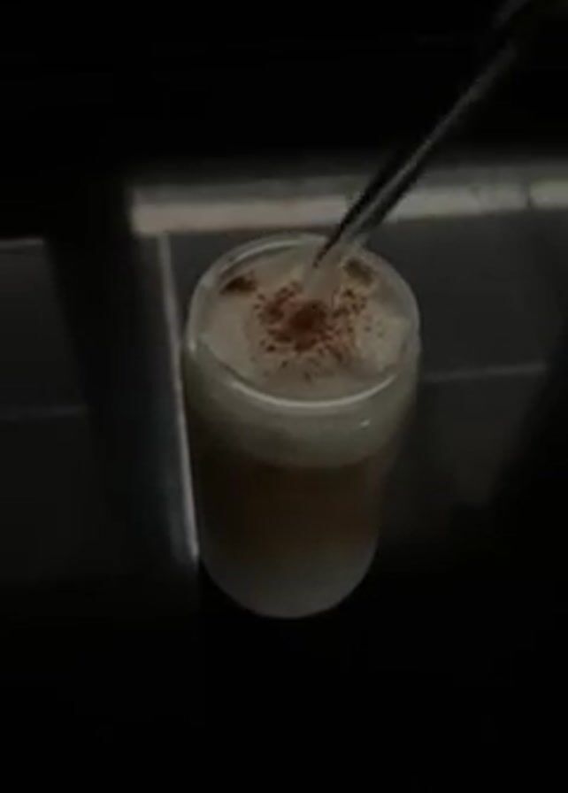 - "glass of iced coffee with a layer of foam on top, sprinkled with what appears to be cinnamon" by FM-Tottj1, licensed under CC BY 4.0