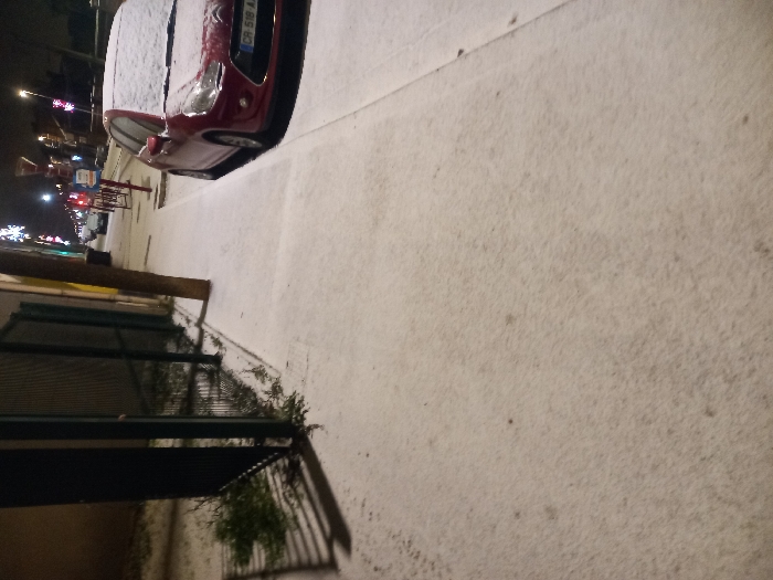 A snowy street scene at night. A burgundy car parked partially on the snowy sidewalk, covered in snow. A green fence and vegetation are on the left side. Distant blurred lights suggest a town or city street. The ground and surfaces are covered in a layer of snow, indicating a recent snowfall.