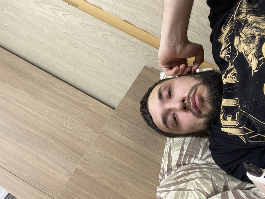 A selfie depicts a man with a beard resting on a patterned pillow, his head tilted towards the camera. He's wearing a black shirt with a gold design. His hand is near his ear. The background features wooden planks, some lighter in color, and a strip of yellow material is also visible.