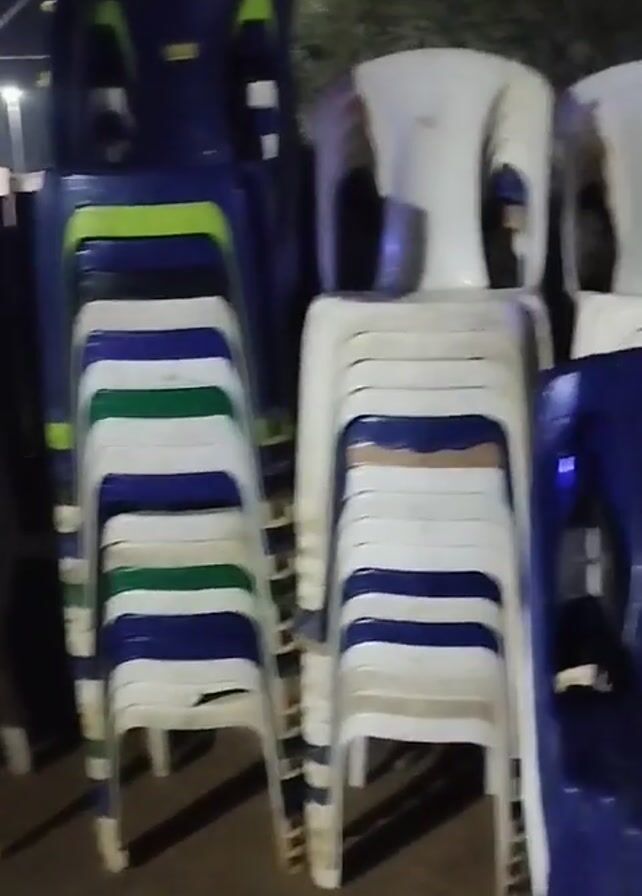 collection of stacked plastic chairs, primarily white and blue, with some featuring green or red accents. The chairs are arranged in multiple stacks, some leaning slightly. The setting appears to be outdoors, possibly at night, based on the low lighting. The camera moves slightly, providing different angles of the stacked chairs. Sounds of music can be heard in the background.