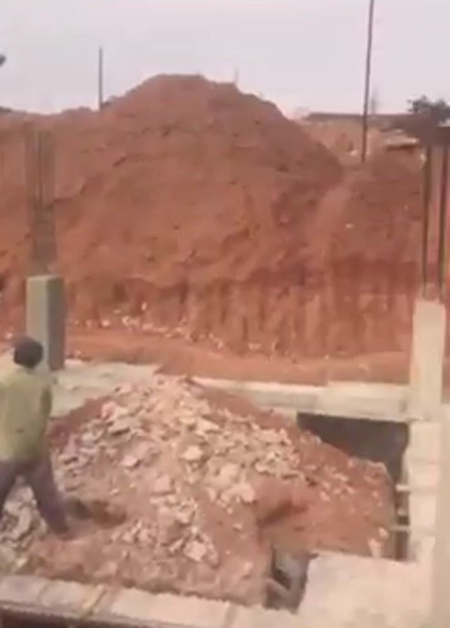 n ongoing construction site under a cloudy sky. Initially, we see a foundation with concrete blocks and reinforcing bars rising from concrete columns. Then the camera pans to show a larger structure, also under construction, with concrete pillars supporting a horizontal framework, possibly for a ceiling or another level. Later in the video, the structure continues to expand showing construction workers operating in the distance. The ground is predominantly red dirt with piles of materials scattered around, typical of a construction site. There is a tall light tower on the right side.