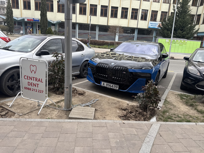 The image displays an urban street scene in what is identified as the city of Sliven, Bulgaria, under an overcast sky. In the foreground, a paved pedestrian area transitions into a series of unpaved, dirt parking zones. A white A-frame sign is prominently positioned on the left, displaying a red tooth graphic above the text "CENTRAL DENT" and a Bulgarian phone number "0988 212 227". This sign stands next to a gray metal pole from which a silver chain extends, connecting to a concrete slab on the ground. Three vehicles are parked facing the viewer. On the far left, a silver sedan with black aftermarket wheels is partially visible. Centrally located is a two-tone dark blue and black BMW sedan, bearing Bulgarian license plate 'A 8964 PP', parked in a dirt patch. To its right, the front section of a dark-colored Ford Focus is visible. Small, leafless deciduous bushes are planted in the dirt areas around the parked cars. In the background, across a street or access lane, a multi-story building with a light-colored facade and numerous rectangular windows is visible. The building features signage including 'РИБОЛОВЕН МАГАЗИН' (Fishing Shop) and 'euro land'. A green 'BOX NOW' parcel locker unit is situated to the right of the building's entrance. A tall, dark coniferous tree stands in front of the building. No individuals are clearly discernible within the scene.