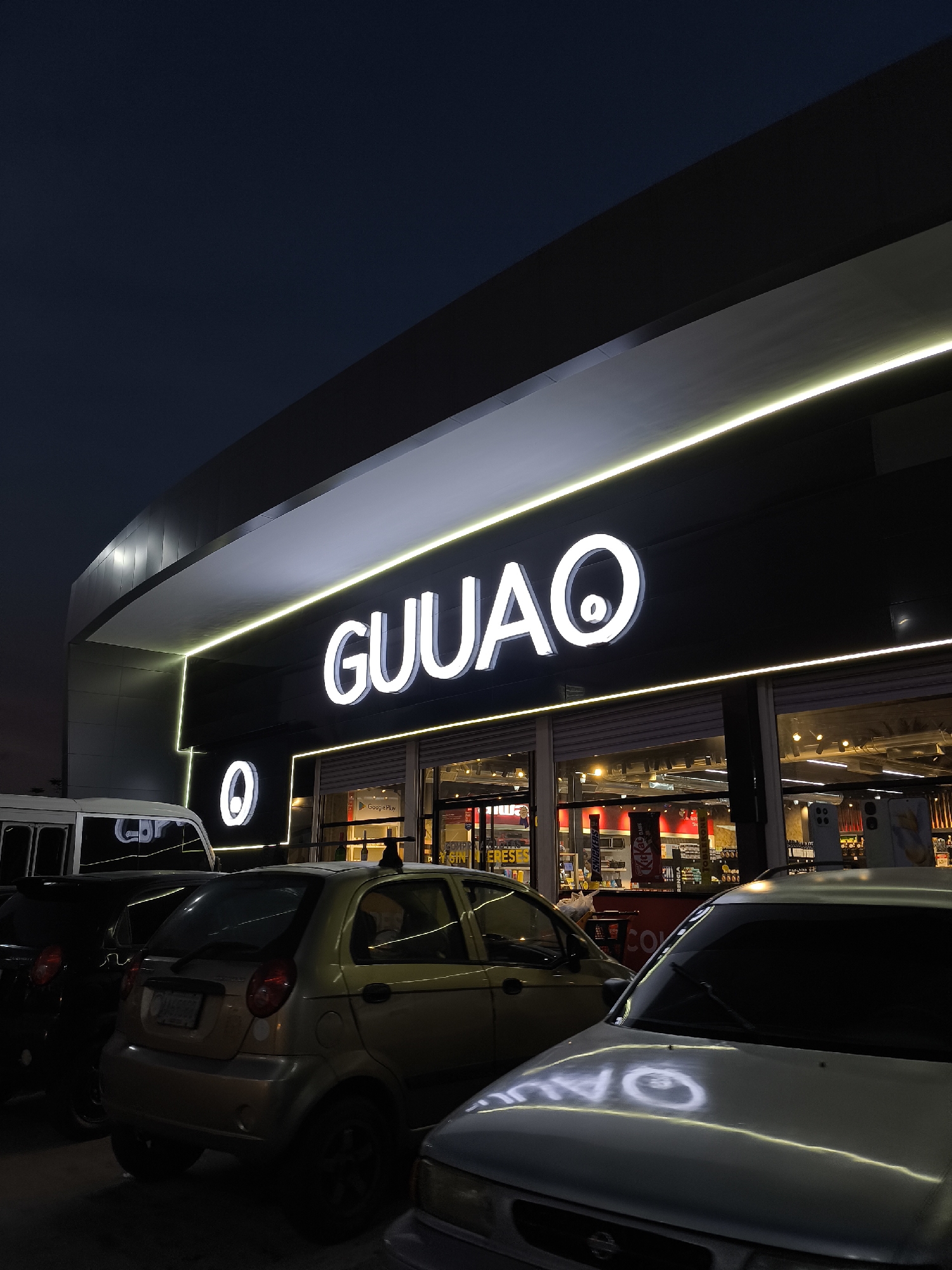 The image depicts the exterior of a "GUUAO" store at night. The building features a modern architectural design with bright illuminated signage. Several cars are parked in front of the store. The environment is dimly lit, suggesting the photograph was taken during the evening. Inside the store, shelves of merchandise and a checkout counter are visible through the glass windows. The location is Las Barrancas, Venezuela.