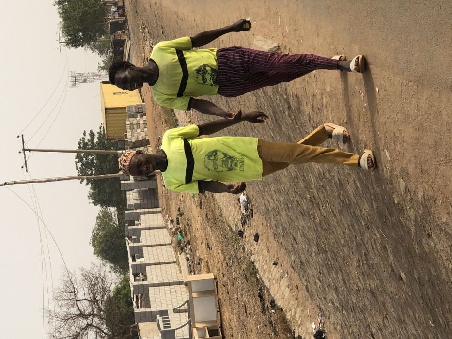 Two young adult males walk hand-in-hand from left to right on an unpaved road in Karu, Nigeria
