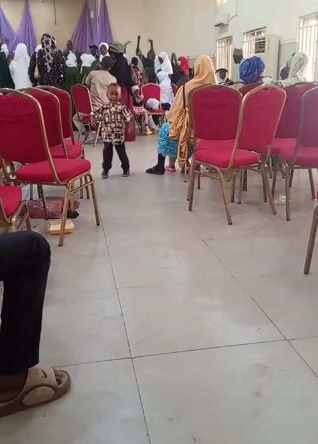 child dancing in a large room with red chairs and a tile floor. There are people, mostly women wearing hijabs, in the background raising their hands and participating in what appears to be a celebration or event. The room is well-lit with natural light coming through the windows. The camera seems to be held by a person sitting on a chair in the foreground, partially visible.