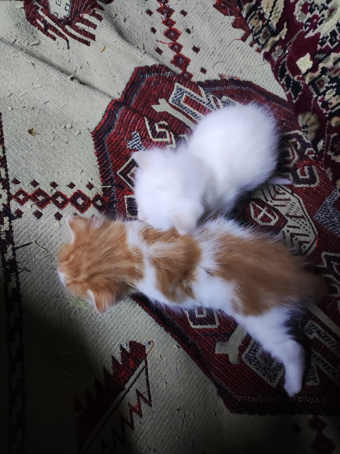 Two kittens are depicted resting on a patterned textile surface. One kitten, predominantly white, is positioned in the upper right quadrant of the image, partially out of focus and obscured. The second kitten, displaying a ginger and white fur pattern, lies horizontally across the lower center, with its head oriented towards the left. Both animals are viewed from above. The textile is identified as a rug or carpet, featuring a light beige background adorned with a repetitive geometric design rendered in dark red and black. Small, light-colored particulate debris is scattered across the rug's surface. The scene is illuminated by indoor lighting, casting soft shadows on the lower left portion of the frame. The image does not contain any visual identifiers to confirm a specific location within Svetlyi, Russia.