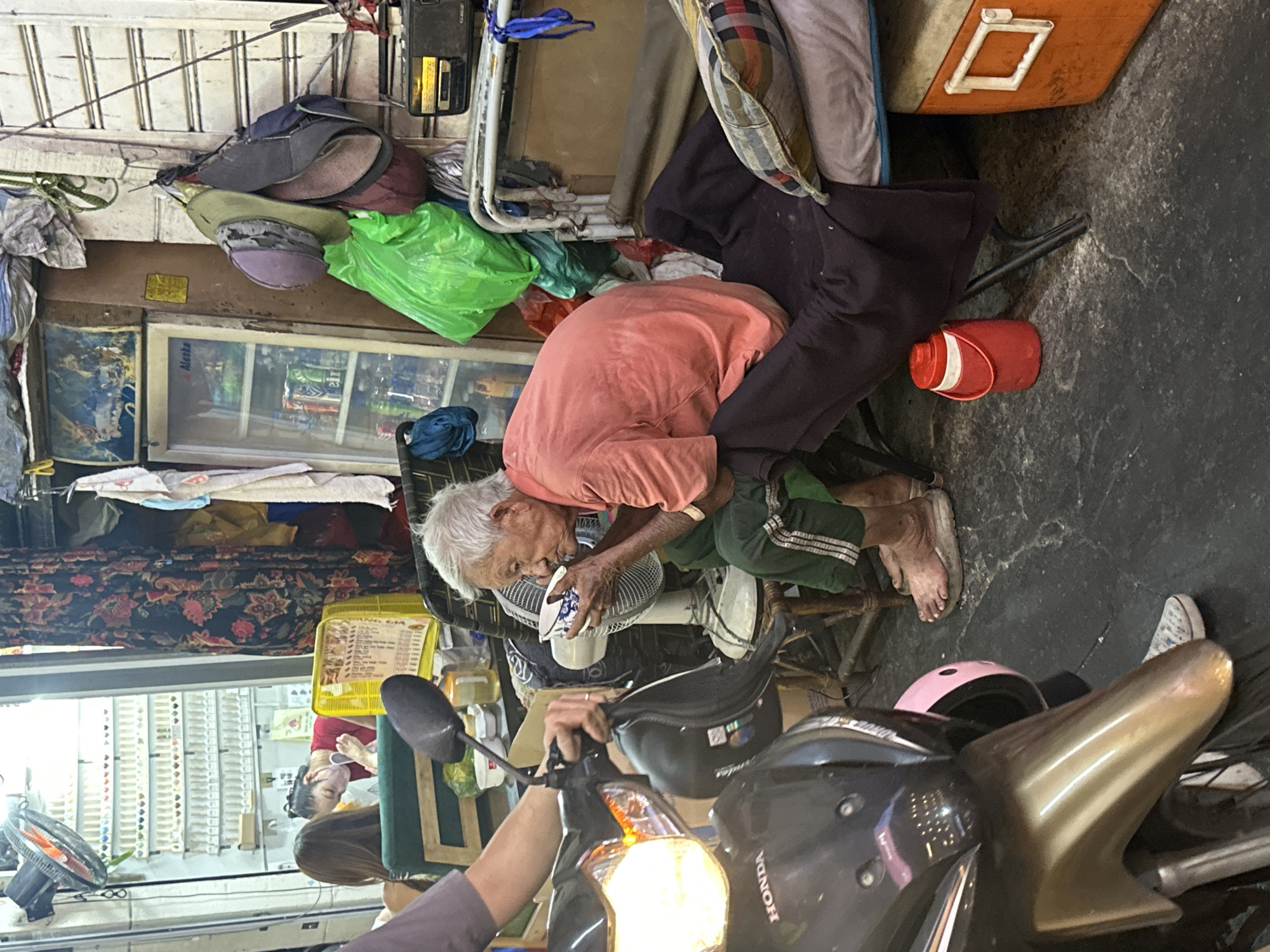 The image depicts a cluttered commercial and living space within Thủ Đức, Vietnam. In the foreground, the front section of a dark grey Honda motorcycle is visible on the left, with its headlight illuminated and a pink helmet hanging from the handlebars. A person's right arm and hand, wearing a dark-colored sleeve, grasp the motorcycle's right handlebar. In the mid-ground, an elderly man with white hair and bare feet sits on a makeshift chair or cot, facing right in profile. He wears a coral-pink short-sleeved shirt and dark green track pants with white stripes. He is actively drinking from a small white bowl with blue patterns. To his left, a white oscillating desk fan rests on a low wooden stool. An orange cooler and a red thermal flask are positioned on the dark, worn floor to his right. A plaid pillow and dark fabric cover a portion of a cot or bed frame extending behind him. The background reveals a multi-purpose area. Behind the elderly man, an "Alaska" branded refrigerator with a glass door displays various beverages, including soda cans and water bottles. Adjacent to the refrigerator, several worn hats (green, purple, dark) and a bright green plastic bag hang from hooks on a wall. A black radio/boombox sits on a shelf to the right of the hanging items. A floral-patterned curtain (red and black) partially obscures the left side of this background section. Further into the background, through an open doorway or glass partition, a brightly lit interior of what appears to be a nail salon is visible. One woman, with long dark hair, is seen from behind, seated at a table. Another woman, wearing a red top and a white face mask, leans forward, seemingly attending to a client's hands. Shelves along the back wall are lined with numerous white bottles of nail polish, each topped with a small heart design. A yellow plastic basket containing a menu or price list is situated on a table in front of these shelves. A small black wall-mounted fan is visible in the upper left corner of this background salon area.