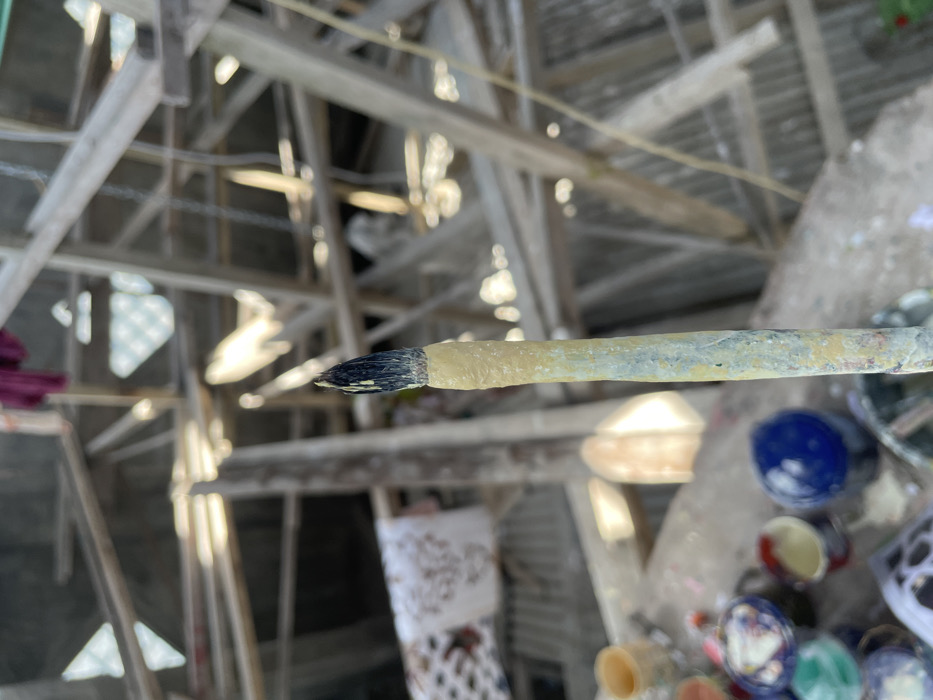 The image captures a close-up of a well-used paintbrush, held upright and centered in the foreground, against a blurred backdrop of an outdoor or semi-outdoor workshop in Kumbang, Indonesia