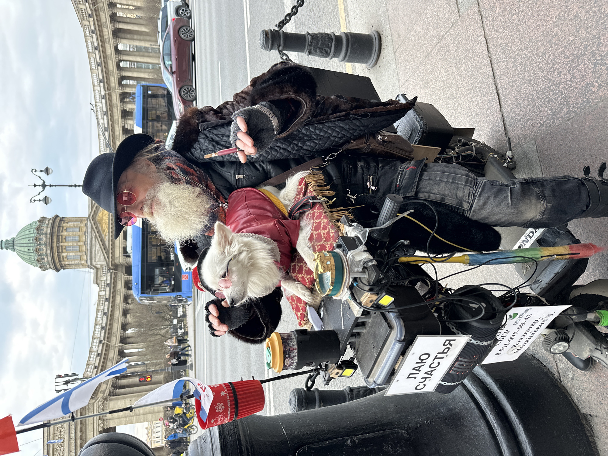 A medium, angled shot shows a man and his dog, sitting on a wheeled mechanism that resembles a cannon in Saint Petersburg, Russia. The man, dressed in black with a black hat, a fur-trimmed jacket, and pink-tinted glasses, holds a slim, red object. He has a long, white beard. A white dog wearing a red coat and matching pink glasses sits beside him. Both are on a black, cannon-like contraption. Affixed to the front are signs and electronics, including a speaker. One sign reads "Лаю Счастья" (which roughly translates to "Barking Happiness"). Behind them is the cityscape of Saint Petersburg, featuring a green-domed building and vehicles, including a blue bus and a red car. Russian flags are visible. The scene takes place on a city street, with buildings visible in the background.