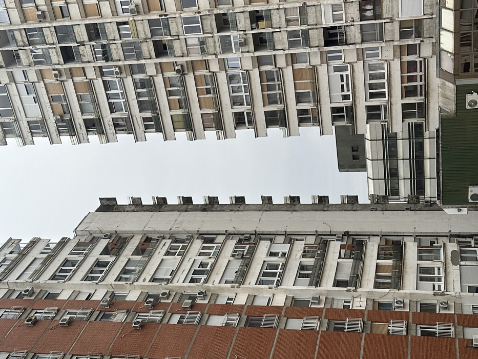This image depicts a dense urban environment within Palilula Urban Municipality, Serbia, primarily featuring the facades of several multi-story buildings under an overcast sky. In the foreground, two prominent high-rise residential buildings dominate the frame. The building on the left features a red brick exterior on its visible left side, transitioning to a light-colored, possibly off-white, concrete or stucco facade on its right. It displays numerous recessed balconies with white railings and an abundance of wall-mounted air conditioning units below windows and on balcony walls. Windows are predominantly multi-pane, with some featuring closed roller blinds. The building on the right is entirely light-colored, appearing as a weathered, off-white or grey concrete structure. Its facade is characterized by a staggered, protruding balcony design with narrow, dark railings. This building also presents numerous multi-pane windows, many with visible orange or brown roller blinds, and a significant number of external air conditioning units. Between and below these two main structures, additional buildings are visible. A darker, rectangular building with minimal windows is present in the mid-ground. Below it, a structure with a reflective glass and metal facade featuring horizontal stripes is seen. At the bottom of the image, parts of a dark green roof and a skylight structure with further air conditioning units are visible. No people are discernible in the scene.