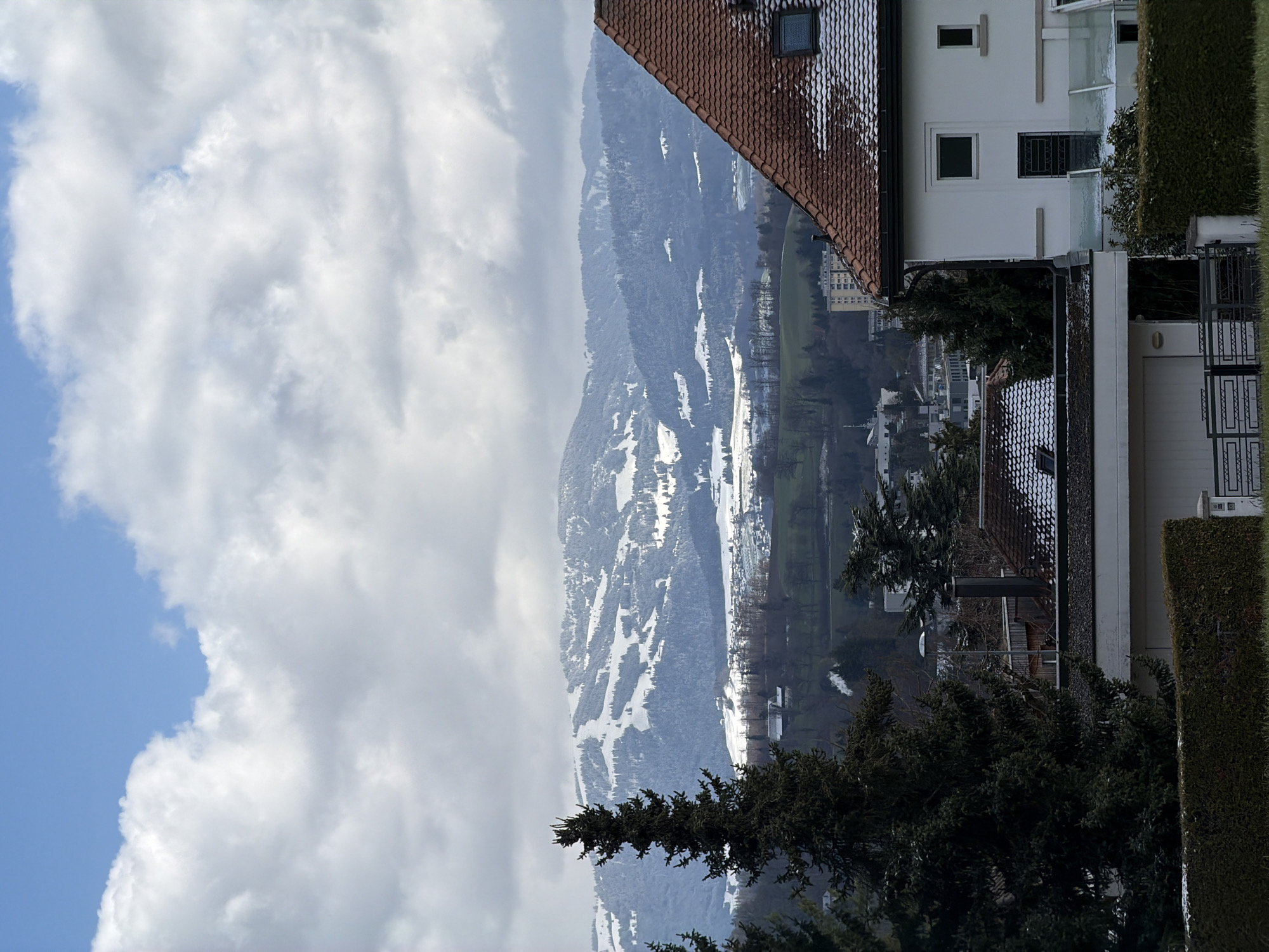 The image depicts a panoramic view of a residential area in Fribourg - Freiburg, Switzerland, set against a backdrop of snow-covered mountains under a partially cloudy sky. In the foreground, occupying the lower right, stands a white residential building featuring a reddish-brown tiled roof, partially dusted with snow. The structure includes multiple rectangular windows, a smaller square window, and a dark-framed door with a decorative metal grate. A modern glass railing outlines a balcony or terrace extending from its side. To the left, a prominent dark green evergreen tree occupies the mid-foreground. Below and behind the white building, another structure with a flat, dark, snow-dusted roof is partially visible, positioned behind a trimmed green hedge and a dark metal fence with a geometric pattern. A dark chimney protrudes from this roof. The midground reveals a sprawling residential landscape with various buildings, interspersed with both bare deciduous and dark evergreen trees. Patches of green land are visible where snow has melted. A thin wisp of white smoke rises from a chimney in the mid-left. Further back, a multi-story, light-colored building is discernible. The background features a range of snow-covered mountains, likely the Fribourg Prealps, displaying distinct white patterns consistent with ski slopes or cleared areas, intermingled with dark forested sections. The sky above is characterized by large, white-to-grey cumulus clouds, with intermittent patches of clear blue sky. No individuals are visible in the scene.
