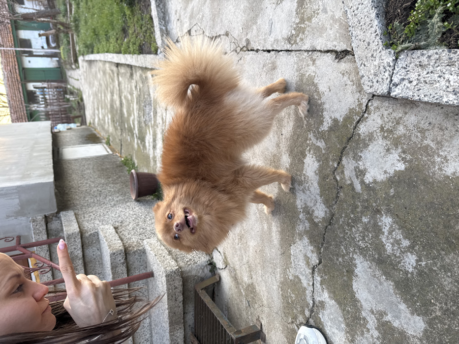 This image depicts an outdoor scene in the city of Zhiten, Bulgaria. In the foreground, a partially visible individual, identified by a left hand with a light pink manicured index finger extended downwards towards a dog. A silver ring is present on the ring finger. The tip of a white sneaker is visible in the lower left. A small, fluffy, reddish-brown dog, consistent with a Pomeranian breed, stands centrally on a concrete surface, looking upwards towards the extended finger. The dog's mouth is slightly open, revealing teeth, and its expression is wide. Its tail is curled over its back. The concrete ground exhibits cracks and scattered damp patches. In the background, to the left, a set of unpainted concrete steps ascends towards a building. A dark brown planter pot rests near the steps. A metal grate object lies on the ground to the left of the dog. A concrete pathway extends into the middle distance, bordered by overgrown green vegetation. Further in the background, a small, light-colored building with a green door and a reddish tiled roof is visible, along with a plastic bottle hanging on what appears to be a fence or wall. The scene is illuminated by natural light, possibly late afternoon, creating soft shadows.