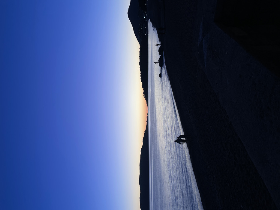 The image depicts a twilight coastal scene in Rafailovići, Montenegro, likely during sunset or civil twilight. The sky dominates the upper two-thirds of the frame, transitioning from a deep royal blue overhead to a lighter blue-violet at the horizon, where a narrow band of orange and yellow hues indicates the sun's position. A calm body of water, appearing as a bay or sea, occupies the mid-ground, reflecting the deep blue of the sky and showing subtle ripples near the shore. Dark, silhouetted landmasses flank the water; a hilly peninsula is visible on the distant left, while a more prominent mountain range with a visible communication tower on its peak extends across the distant right. Along the base of the right-hand mountain, faint artificial lights of a town or settlement are visible. A dark beach, likely composed of sand or pebbles, curves from the immediate foreground along the coastline to the right, mostly in silhouette. Several human figures are present, rendered as dark silhouettes against the lighter water and sky. In the left-midground, an adult and a smaller child walk together along the water's edge, moving towards the right. Further to the right, two additional figures are positioned near or on dark rocks at the water's edge; one stands atop a rock partially submerged in the water. Other indistinct figures are visible further along the dark beach. In the bottom-right corner, a dark, angular structure, possibly a concrete embankment or wall, partially enters the frame, indicating the vantage point.