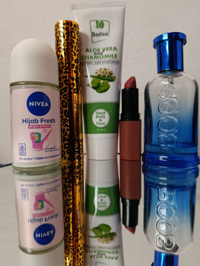 - "The image displays five cosmetic and personal care products arranged upright on a reflective surface against a plain, light-colored wall" by FM-QMs472, licensed under CC BY 4.0