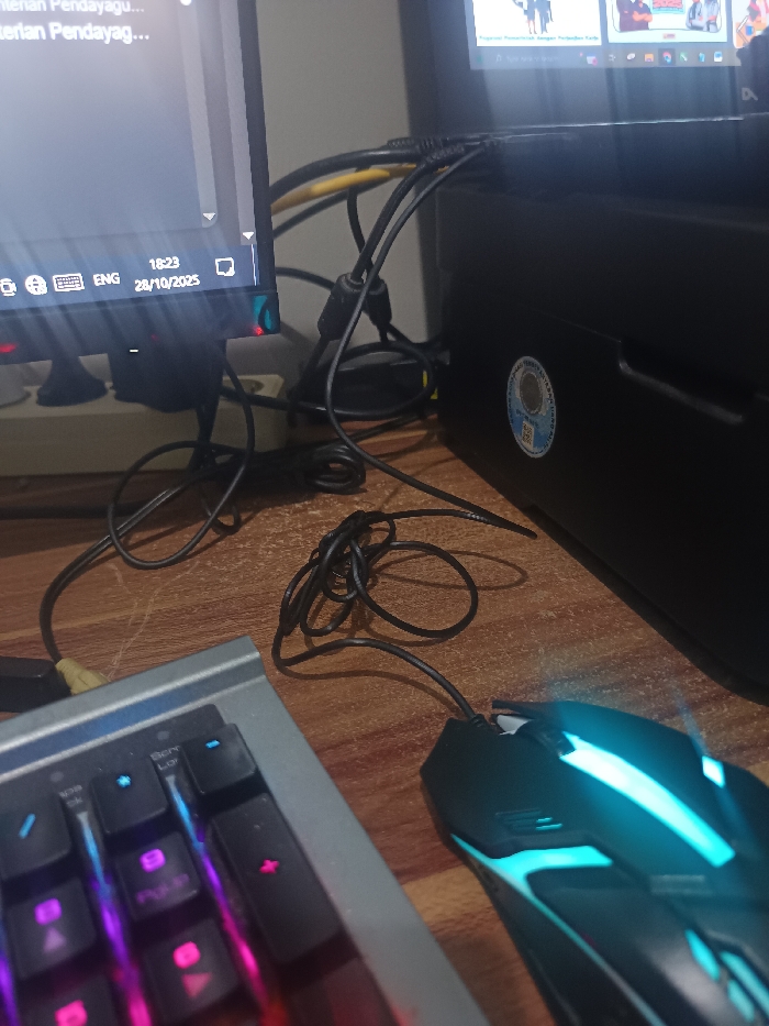This image captures a close-up, angled view of a computer workstation in Maleber, Indonesia. The scene is dominated by electronic equipment on a wooden desk surface. In the upper left, a vertical section of a computer monitor displays a Windows taskbar showing the time "18:23," the date "28/10/2025," and "ENG" for English language settings. Partial text "Menteri Pendayagu..." is visible on the screen. To the right of this monitor, a black computer tower or system unit is visible, featuring a circular certification or warranty sticker on its side. Above the computer tower, a second monitor is partially visible, displaying what appears to be a presentation slide or video frame with two individuals. Numerous black and yellow cables are visible, connecting the monitors to the computer unit and other peripherals; these cables are somewhat tangled behind the monitors. A white multi-outlet power strip is partially visible beneath the left monitor. In the foreground, on the desk, the left side of a computer keyboard with a silver-grey frame is present, featuring black keys illuminated with multicolored (pink, purple, blue) backlighting. To the right of the keyboard, a black, wired gaming mouse with bright cyan/blue LED illumination is positioned. No individuals are present in the image.