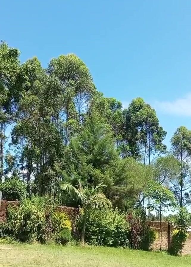 The video displays a verdant landscape under a clear, bright blue sky. In the foreground, a well-maintained lawn stretches out. Behind it, a low brick wall is partially obscured by dense greenery, consisting of varied plants, bushes, and small trees. Beyond the wall, taller trees, including eucalyptus and what appears to be a pine tree, rise against the sky. The overall impression is one of a peaceful and well-tended garden or yard.