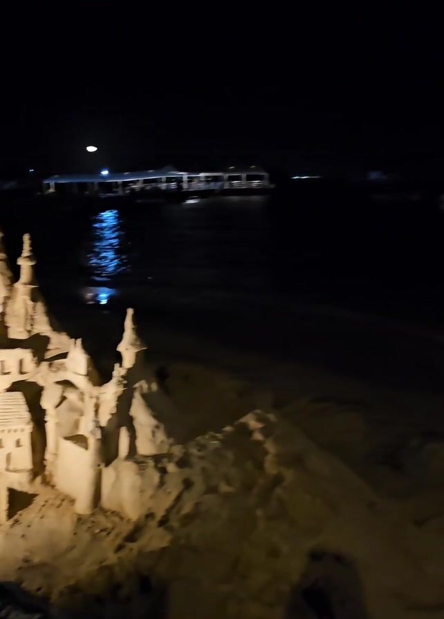 nighttime beach scene. In the foreground is a sandcastle illuminated by a light. There is a small sign next to the sandcastle, but the details are unclear. The camera pans to the right, revealing a view of the ocean, where numerous boats are visible in the distance. The dark sky suggests it is a clear night. The beach appears sandy.