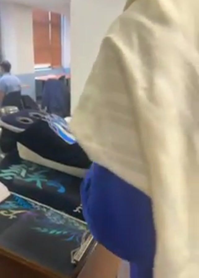 person standing near a counter in a room. The person is wearing a blue shirt and is partially obscured by a white or cream-colored garment draped over their shoulders. On the counter are various items including what appears to be folded clothing or fabric with colorful patterns. In the background, another person wearing a white shirt and a stethoscope is visible. They appear to be looking in the direction of the camera. The environment seems to be a library or an office space with desks and other people in the background.