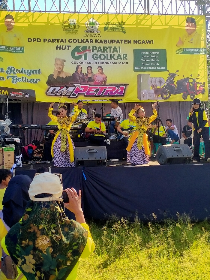 The image depicts an outdoor event on an elevated stage in Sine, Indonesia. A large yellow banner serves as the backdrop, displaying "DPD PARTAI GOLKAR KABUPATEN NGAWI" and "HUT 61th PARTAI GOLKAR," with the slogan "GOLKAR SOLID INDONESIA MAJU." It features images of two men (AhliL Lahadalia and H. Widodo Wahyuhana, M.Si), four women, and the text "OM PETRA." The banner also lists "Pesta Rakyat," "Jalan Sehat," "Tebus Murah," "Donor Darah," and "Cek Kesehatan Gratis," alongside images of a refrigerator, plates, and three motorcycles. On the stage, two female dancers in traditional-style yellow tops and batik patterned skirts with ornate headpieces are performing, both with raised arms. Behind them, several male musicians in yellow t-shirts operate instruments including drums, a keyboard (KORG), and guitars. To the far right, a female vocalist or MC in a black baseball cap, black vest, and yellow shirt holds a microphone. Two large grey stage speakers are visible on the stage floor, along with other stage equipment. In the foreground, an audience member is viewed from behind, wearing a yellow long-sleeved shirt, a dark green patterned hijab, and a beige baseball cap. This individual holds a smartphone with both hands, aimed towards the stage, apparently recording or photographing the event. The ground in the immediate foreground is a grassy area with sparse vegetation. The scene is illuminated by natural daylight.
