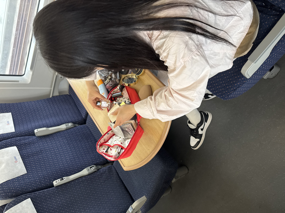 Within a passenger train compartment in Nanhai District, China, a person is observed from a high angle, seated on the right side of the aisle. The individual, characterized by long, dark hair, is wearing a light-colored, long-sleeved shirt, white socks, and black and white athletic shoes. They are actively engaged in organizing or using contents from a red zippered cosmetic bag positioned on a light wooden tray table. The right hand holds a small, clear glass bottle, while the left hand holds a rectangular compact. The open cosmetic bag contains numerous items, including various makeup products, brushes, and a blue and orange sunscreen tube. A beige beauty blender and a circular gold-toned compact are also visible on the tray table. In front of the person, two unoccupied blue fabric train seats with patterned upholstery and light grey armrests are visible. Each seat features a white headrest cover marked with a red "CR" logo, indicating China Railway. A train window to the right of the seats reveals a blurred exterior view, suggesting the train is in motion, with visible railway tracks. The floor of the compartment is dark grey.