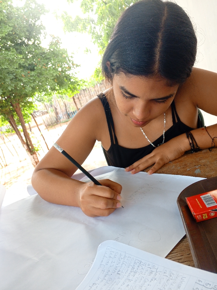 A young female, with dark hair parted centrally, is depicted from a high angle, focused on writing or drawing. She wears a black tank top and a silver-colored chain necklace, with dark bracelets on her left wrist. Her right hand holds a black pencil, which is actively marking a large sheet of white paper on a wooden surface. Faint pencil outlines are visible on the main paper. An open notebook or sheet with handwritten Spanish text in a grid format is positioned in the lower right foreground. Adjacent to the paper, a small red box, possibly containing twelve crayons, rests on the wooden surface. The background is blurred, showing green trees and foliage, indicating an outdoor or semi-outdoor setting with bright, diffused sunlight. A light-colored pillar or wall and a wooden fence-like structure are discernible in the distant background. This scene is located in the city of Altagracia, Venezuela.