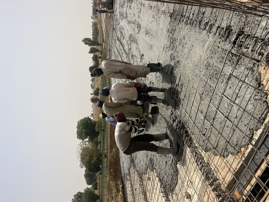 This image captures an outdoor concrete pouring operation in Gyellesu, Nigeria, during daylight hours under a hazy sky
