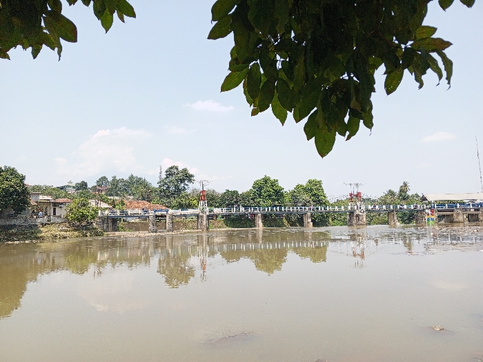 A wide, murky river in Calbayog, Philippines, is viewed under a bright, mostly clear blue sky