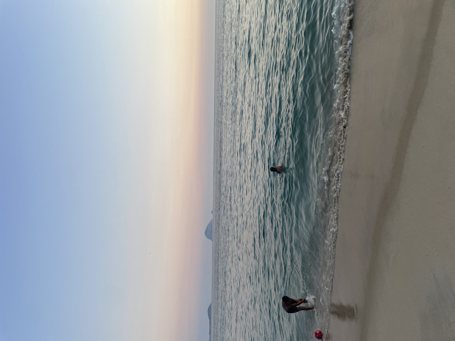 A tranquil beach scene unfolds under a soft, gradient sky. A person wades near the shoreline while another swims further out in the calm, rippling water. Fine sand meets the sea, creating a peaceful transition. A red ball sits near the edge of the beach, adding a splash of color to the muted tones. Distant mountains provide a subtle backdrop.